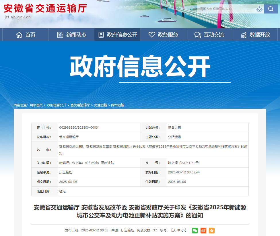 安徽省交通運輸廳安徽省發(fā)展改革委安徽省財政廳關(guān)于印發(fā)《安徽省2025年新能源城市公交車(chē)及動(dòng)力電池更新補貼實(shí)施方案》的通知