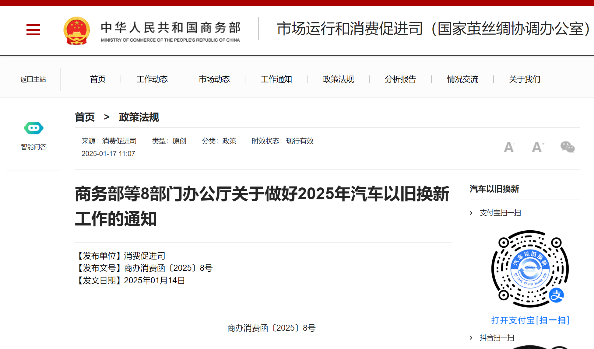 商務(wù)部等8部門(mén)辦公廳關(guān)于做好2025年汽車(chē)以舊換新工作的通知