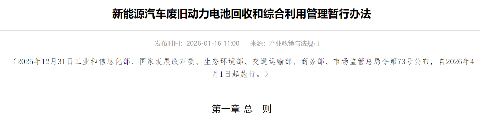 工信部等六部門聯(lián)合印發(fā)《新能源汽車廢舊動力電池回收和綜合利用管理暫行辦法》