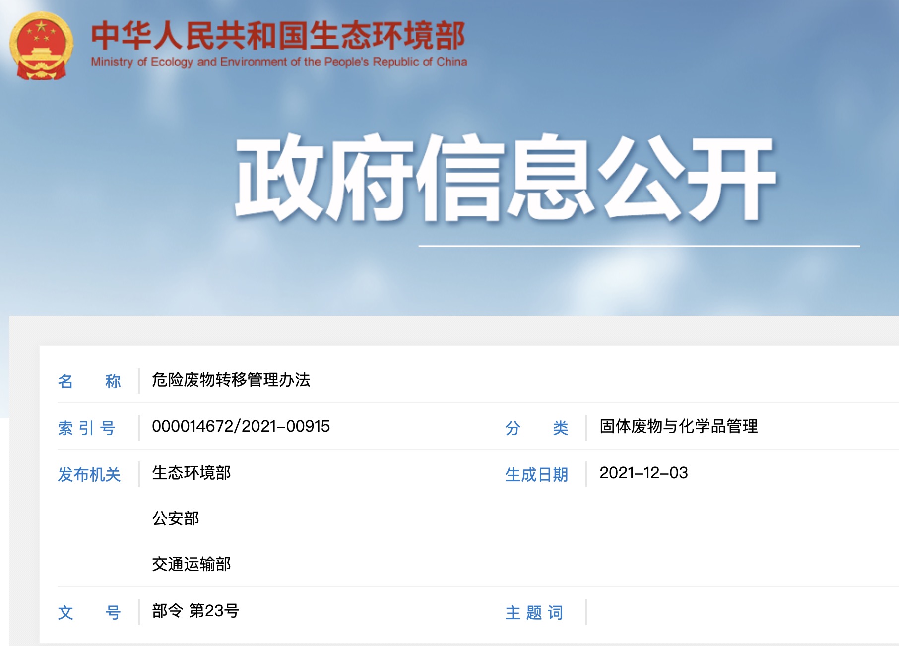 《危險廢物轉移管理辦法》已于2021年9月18日由生態(tài)環(huán)境部部務(wù)會(huì )議審議通過(guò),并經(jīng)公安部和交通運輸部同意,現予公布,自2022年1月1日起施行。