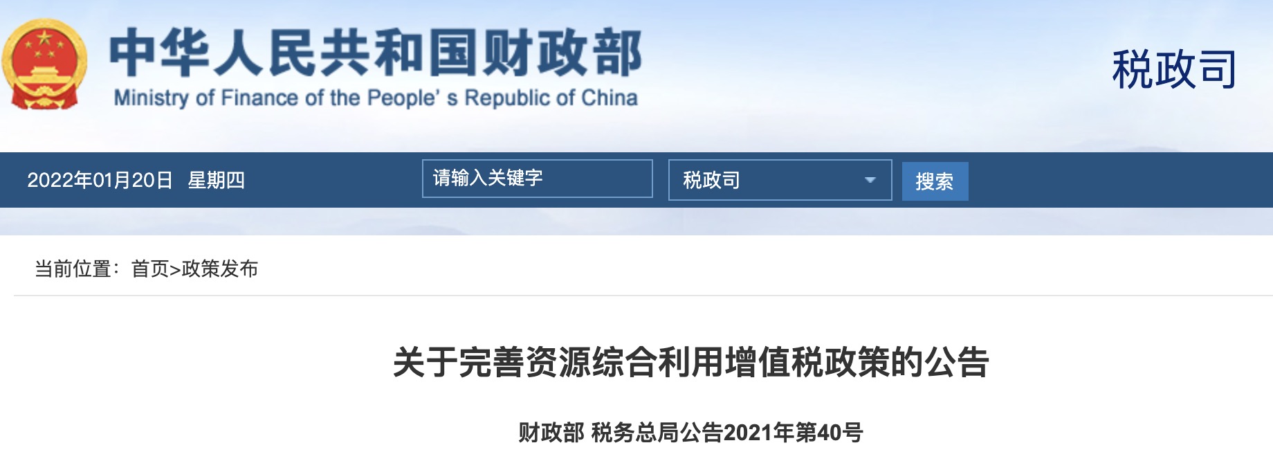 關(guān)于完善資源綜合利用增值稅政策的公告財政部稅務(wù)總局公告2021年第40號為推動(dòng)資源綜合利用行業(yè)持續健康發(fā)展,現將有關(guān)增值稅政策公告如下:一、從事再生資源回收的增...