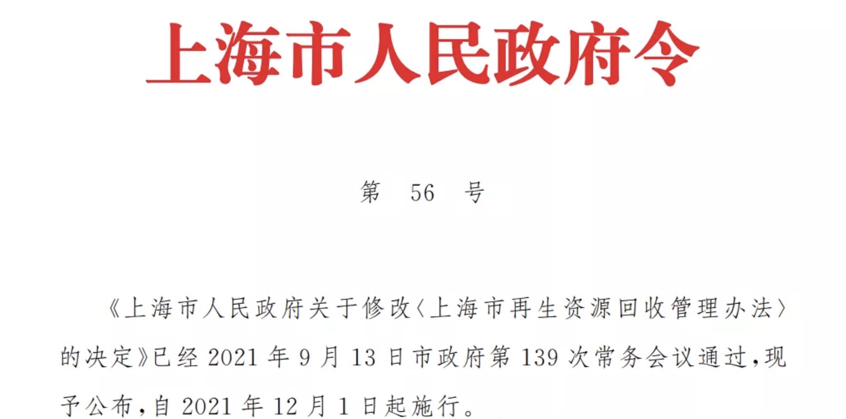 《上海市人民政府關(guān)于修改〈上海市再生資源回收管理辦法〉的決定》已經(jīng)2021年9月13日市政府第139次常務(wù)會(huì )議通過(guò),現予公布,自2021年12月1日起施行。
