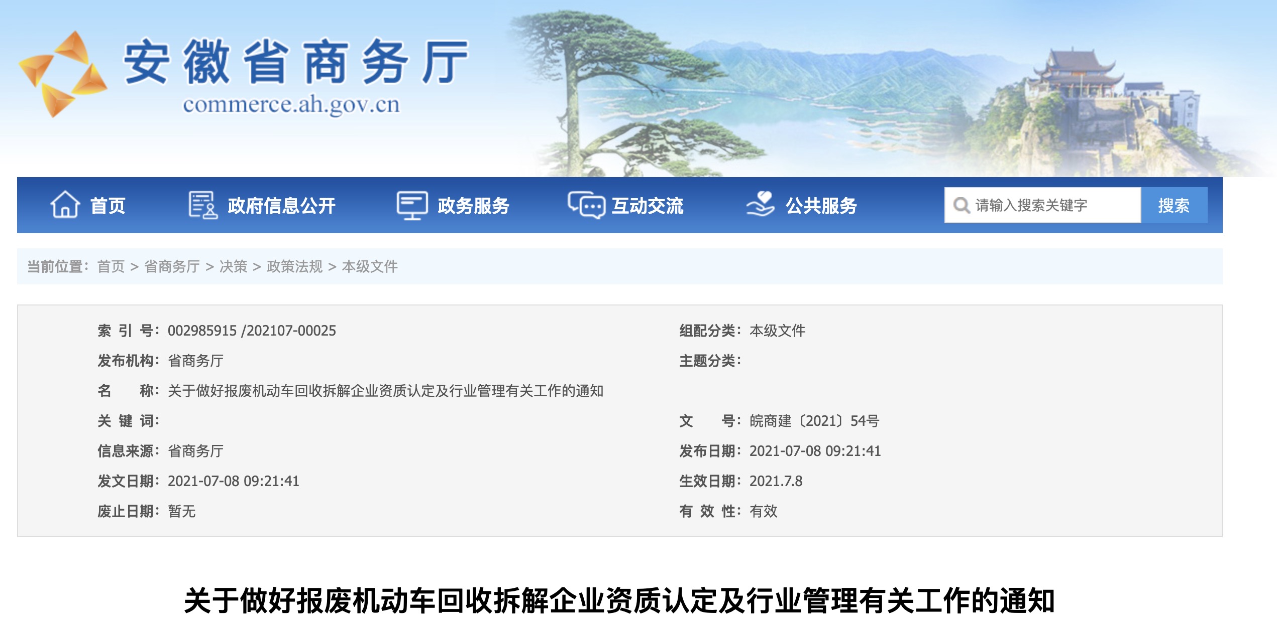 2021年7月,省商務(wù)廳、省發(fā)展改革委、省經(jīng)信廳、省公安廳、省生態(tài)環(huán)境廳、省交通運輸廳 、省市場(chǎng)監管局聯(lián)合印發(fā)《關(guān)于做好報廢機動(dòng)車(chē)回收拆解企業(yè)資質(zhì)認定及行業(yè)管理...