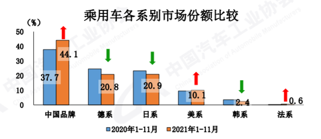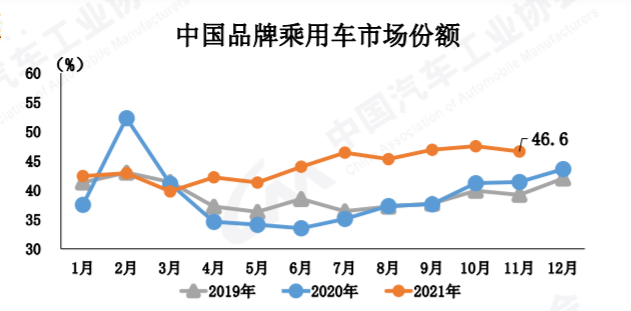 11月,中國品牌乘用車(chē)仍處于向上發(fā)展的區間,無(wú)論是銷(xiāo)量還是市場(chǎng)份額都在持續增長(cháng),已經(jīng)連續8個(gè)月保持增長(cháng)。11月,中國品牌銷(xiāo)量達到了102.2萬(wàn)輛,同比增長(cháng)7.2%;市場(chǎng)份額上升了5.2個(gè)百分點(diǎn),來(lái)到46.6%。