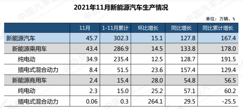 工信部原產(chǎn)業(yè)政策司副巡視員、中國國際工程咨詢(xún)公司專(zhuān)家學(xué)術(shù)委員會(huì )專(zhuān)家李萬(wàn)里表示,1-11月產(chǎn)量超過(guò)300萬(wàn)輛,銷(xiāo)量也達到299萬(wàn)輛,這是一個(gè)巨大的變化,是量級的一個(gè)新躍升;也體現著(zhù)市場(chǎng)牽引的力量更加明顯,超過(guò)了政策牽引的力量;并且今年以來(lái)新能源汽車(chē)月度產(chǎn)銷(xiāo)量保持連續穩定增長(cháng),均為亮點(diǎn)。中汽協(xié)常務(wù)副會(huì )長(cháng)兼秘書(shū)長(cháng)付炳鋒也表示,我國新能源汽車(chē)銷(xiāo)量2021年逐月快速提升,新能源汽車(chē)市場(chǎng)化進(jìn)入爆發(fā)式增長(cháng)新階段,1-11月產(chǎn)量突破300萬(wàn)輛,這是一個(gè)巨大的變化,它代表著(zhù)發(fā)展新能源汽車(chē)從過(guò)去以政策驅動(dòng)為主,轉向了市場(chǎng)驅動(dòng)。