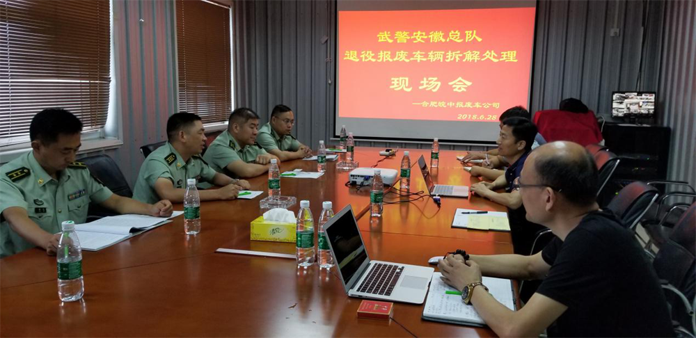 6月28日上午,武警安徽省總隊在合肥市皖中報廢汽車(chē)回收有限責任公司就皖中公司中標的80余輛退役報廢車(chē)輛舉行拆解處理現場(chǎng)會(huì )。武警安徽總隊裝備保障處扶德才處長(cháng)、吳峰副處長(cháng)等6人;玉成有限公司副總裁兼皖中公司總經(jīng)理何學(xué)海、玉成有限公司大客戶(hù)(回收)總監王東峰、皖中公司副總經(jīng)理胡冬祥、吳畏等參加。